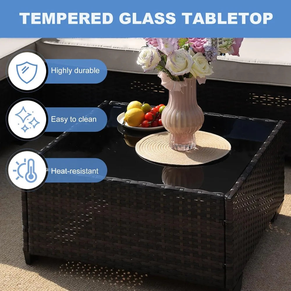 - STURDY & WEATHER-RESISTANT: The patio sofa frame is made of strong steel combined with premium PE wicker, ensuring long-lasting durability to withstand all weather conditions. The waterproof, wear-resistant thickened cushions and tempered glass tabletop are not only durable but also easy to clean, keeping your outdoor furniture looking new.