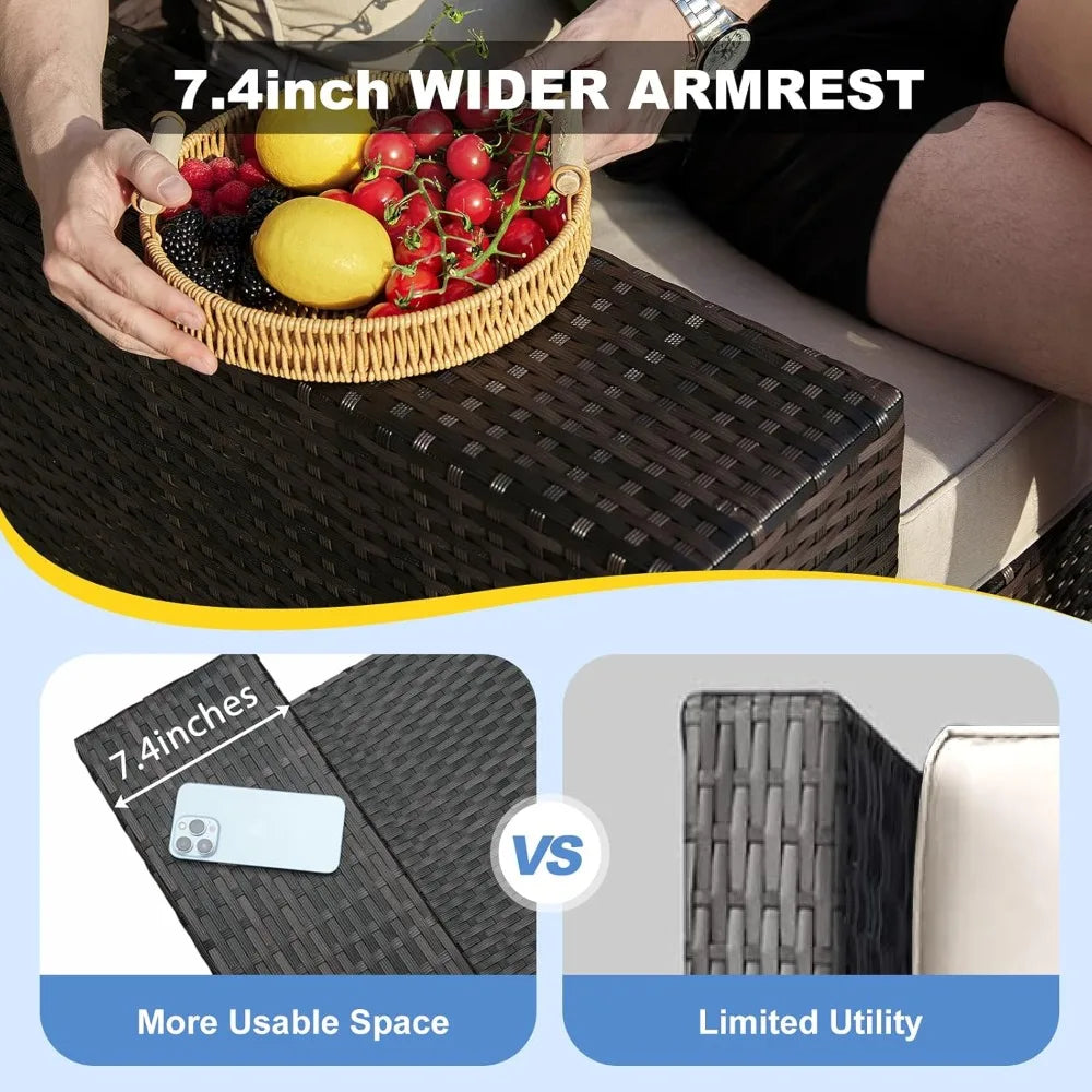 - WIDER ARMREST DESIGN: patio furniture set is specially designed with 7.4inch wide armrests, providing more spacious support and greater comfort compared to the common 4inch armrests on others. Whether resting your arms, placing drinks, or using it as a temporary table, the wide armrests offer added convenience and comfort for your outdoor experience.
